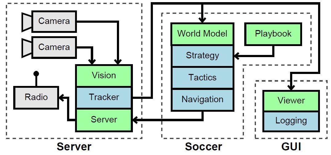 STP consists of Skills for executing the low-level actions that make up robot behavior, Tactics for determining what skills to execute, and Plays for coordinating synchronized activity amongst team members.